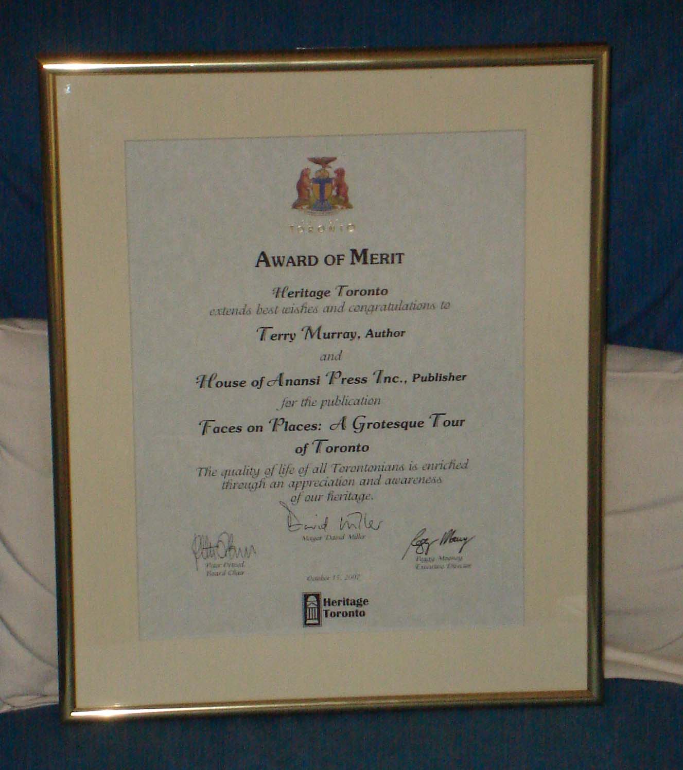 I just got this back from the framing shop at the end of my street. It’s an Award of Merit from Heritage Toronto that was awarded to Faces on Places… well me, actually, and House of Anansi Press, my publisher, last month. I didn’t mean to be ungrateful — the frame was okay — I just wanted to get UV glass.