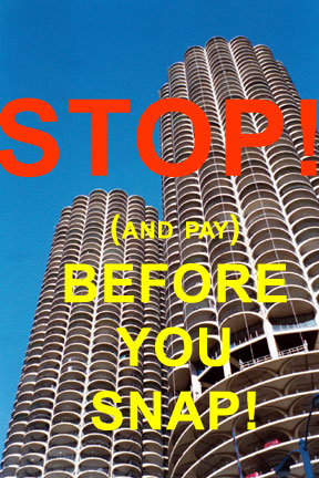 Thanks to Lynn Becker, a writer on Chicago architecture, for letting me use this image (which he created) and for bringing attention to a ludicrous situation that many architectural photographers have run up against in other places. The condo association at Chicago’s iconic Marina City towers, in a move he describes as “equal parts loony and arrogant,” wants photographers to get the association’s “express written permission” to take pictures of the building. The association says that because of “the architectural significance of our building,” it holds a “common law copyright on the use of the Association name and building image,” under state and federal law.