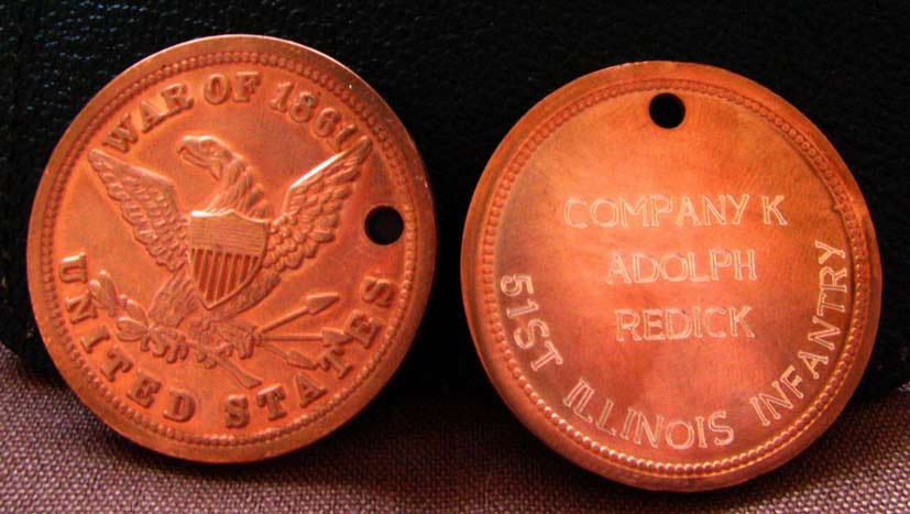 17a8b-frontback(Adolph entered the 51st Illinois as a private, and mustered out as a corporal at the end of the war in 1865. Above is a photo of a replica of his dogtag.)