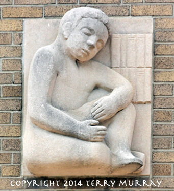 I haven’t shot the Greek gods (they’re not attached to a building), but there are plenty of pictures in the links provided here. However, I’m posting my pictures of some of Cox’s work on buildings, including the figure on the Etobicoke branch of the Toronto Public Library (above) and his Reading-Writing-‘Rithmetic on the Duke of Connaught Public School in the East End.
