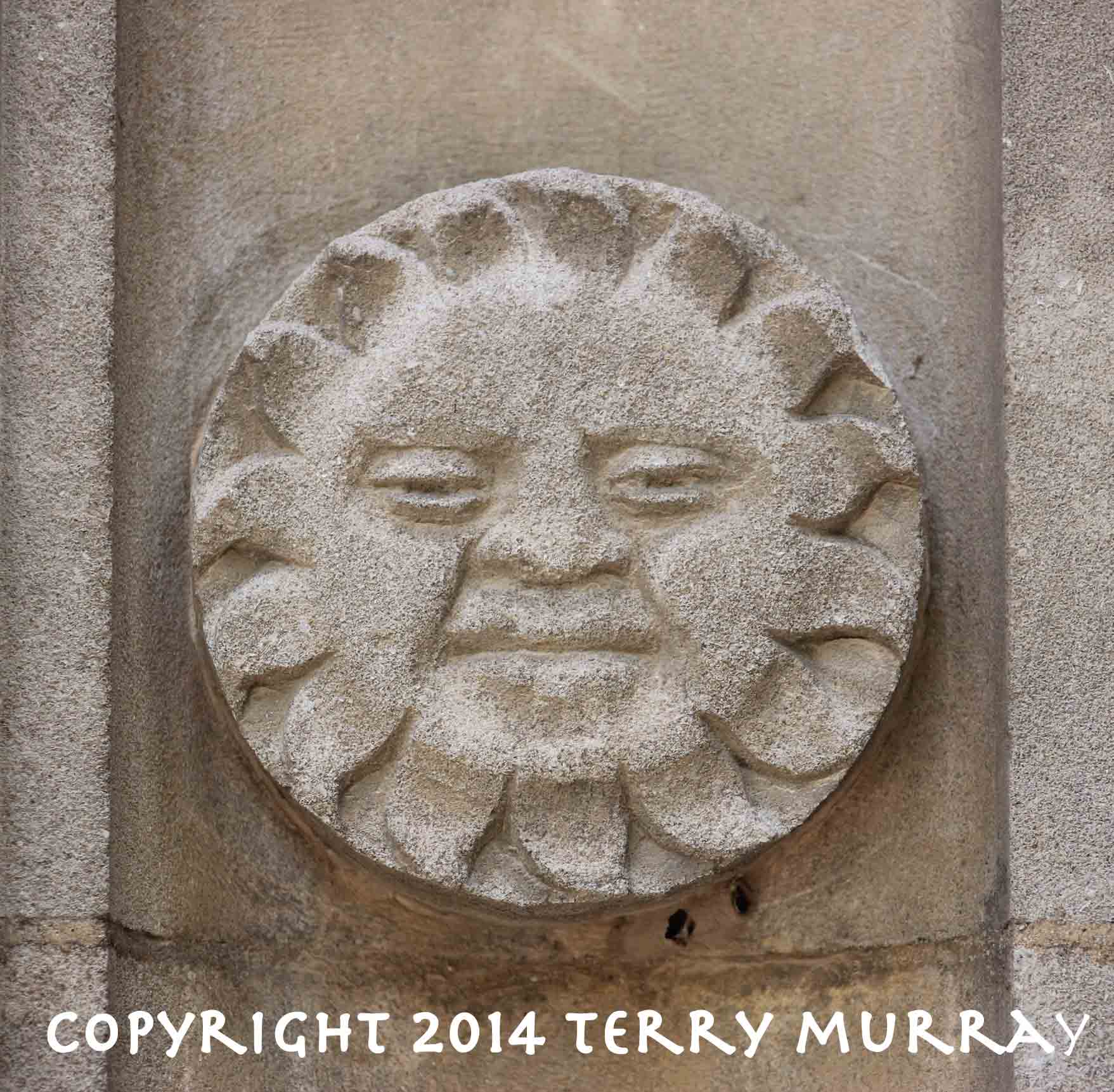 The moon has a companion sun at the west entrance. Prof. Moorcroft explains its presence there by citing a 1924 London Free Press story which reported the stone mason Dan Cree “was surprised one morning by a workman as he was carving the face of a summer sun. ‘What on earth are you putting the face of the sun there for?’ he was asked. ‘Oh, it’s a bit dull this morning,’ was the reply, ‘and I thought I might coax the sun out to see his picture.’ ”