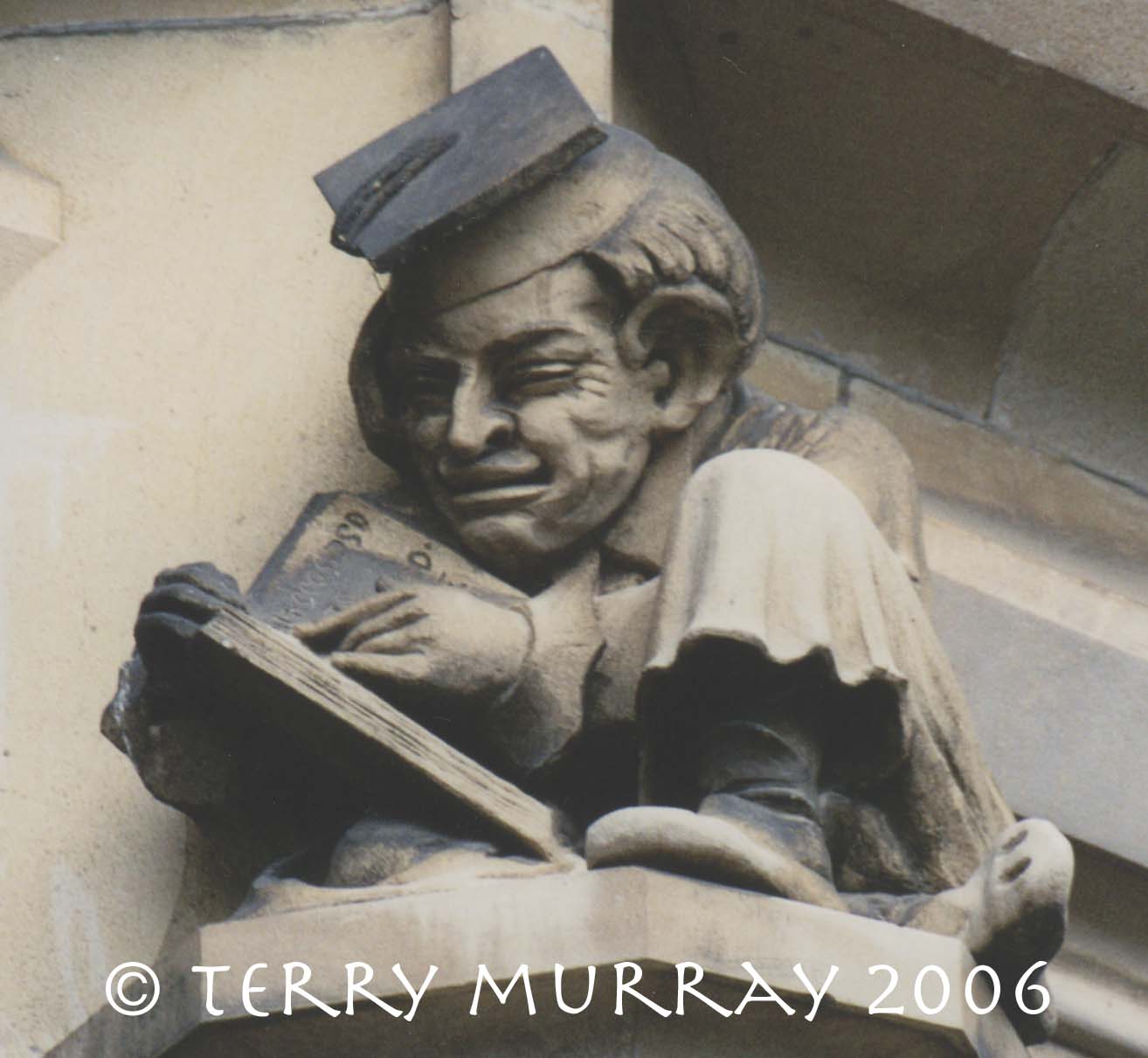 Flanking the main entrance to each building is an academic figure (the Jarvis scholar above – an apparent math phobe, and the Harbord scholar below),